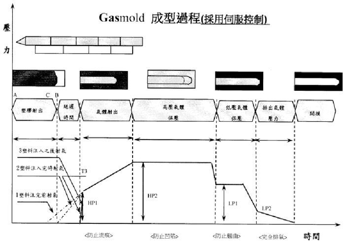 由上圖,可知當射料未完成或完成均可射入氮氣,由氣輔控制器控制氮氣的壓力及時間,以達到保壓的效果,當氣體排出後,再開模取出成品。